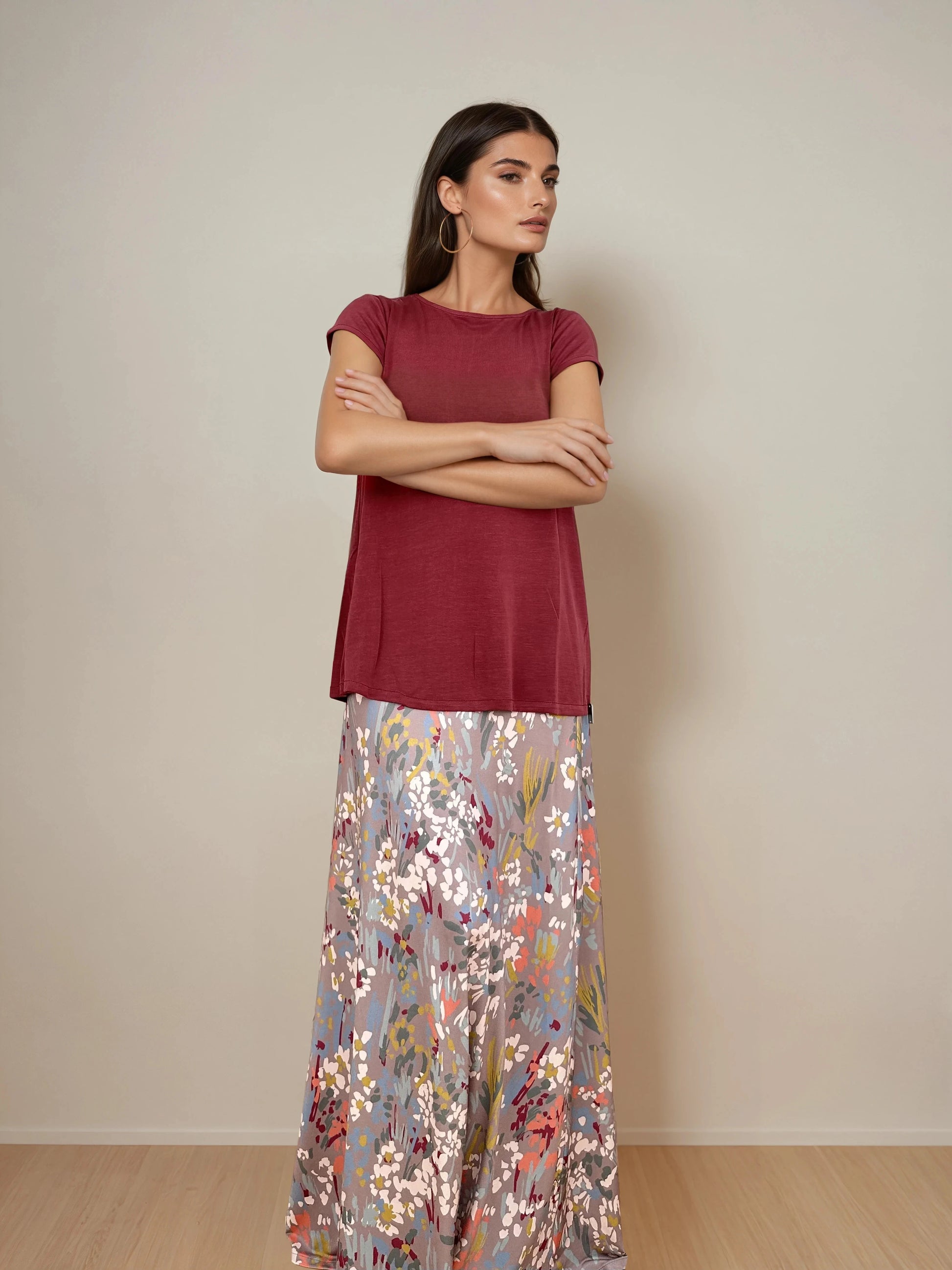 Combina especialmente bien con los pantalones Viri, creando una silueta armónica y actual, o con la falda Cora para un conjunto más fluido y femenino. Y cuando refresca, solo tienes que añadir el cárdigan Lulú para completar el look.