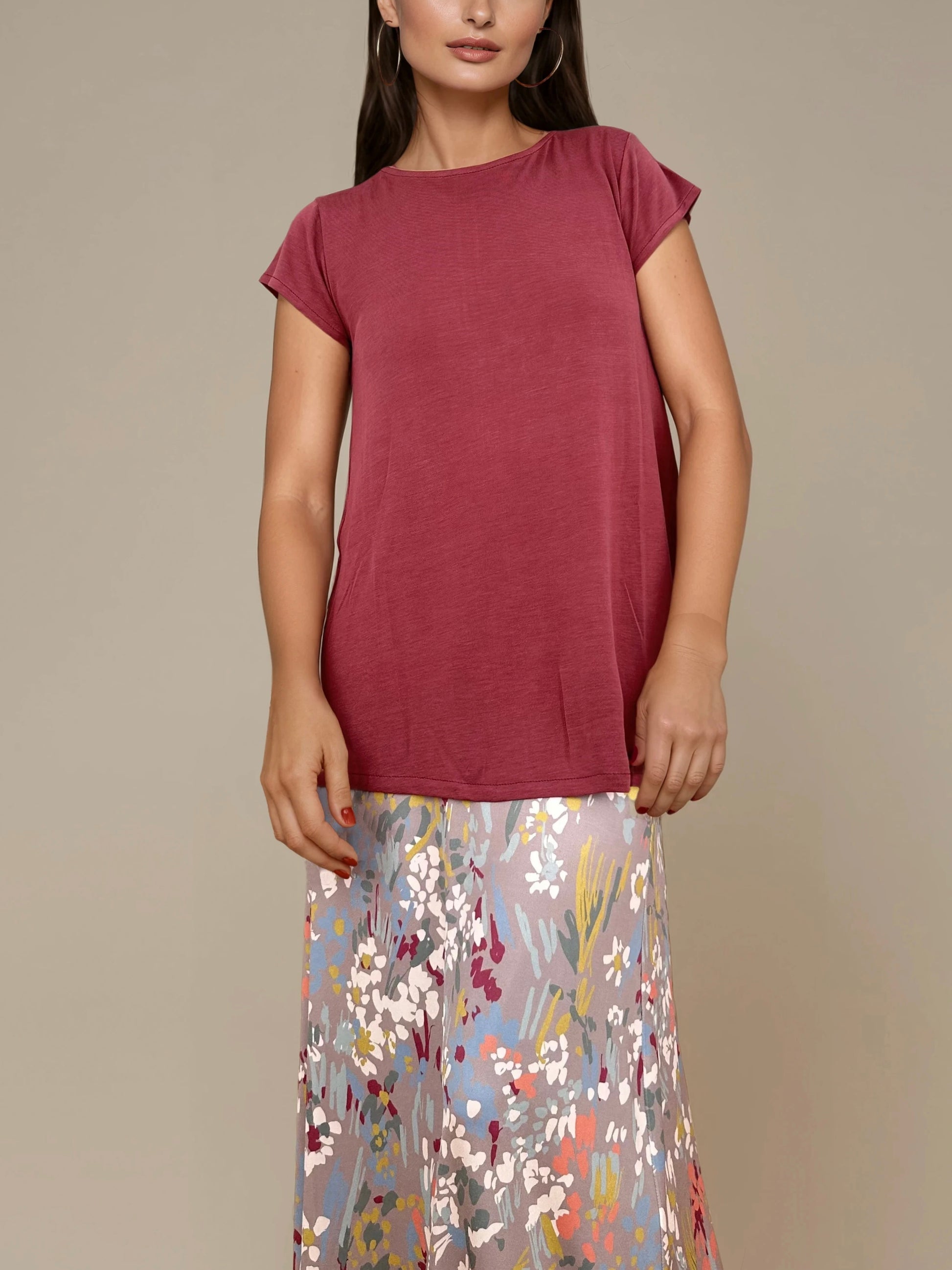 La manga mini cubre sutilmente el hombro, dando un acabado limpio y desenfadado, ideal para los días cálidos o para usar como base bajo chaquetas y cárdigans.
